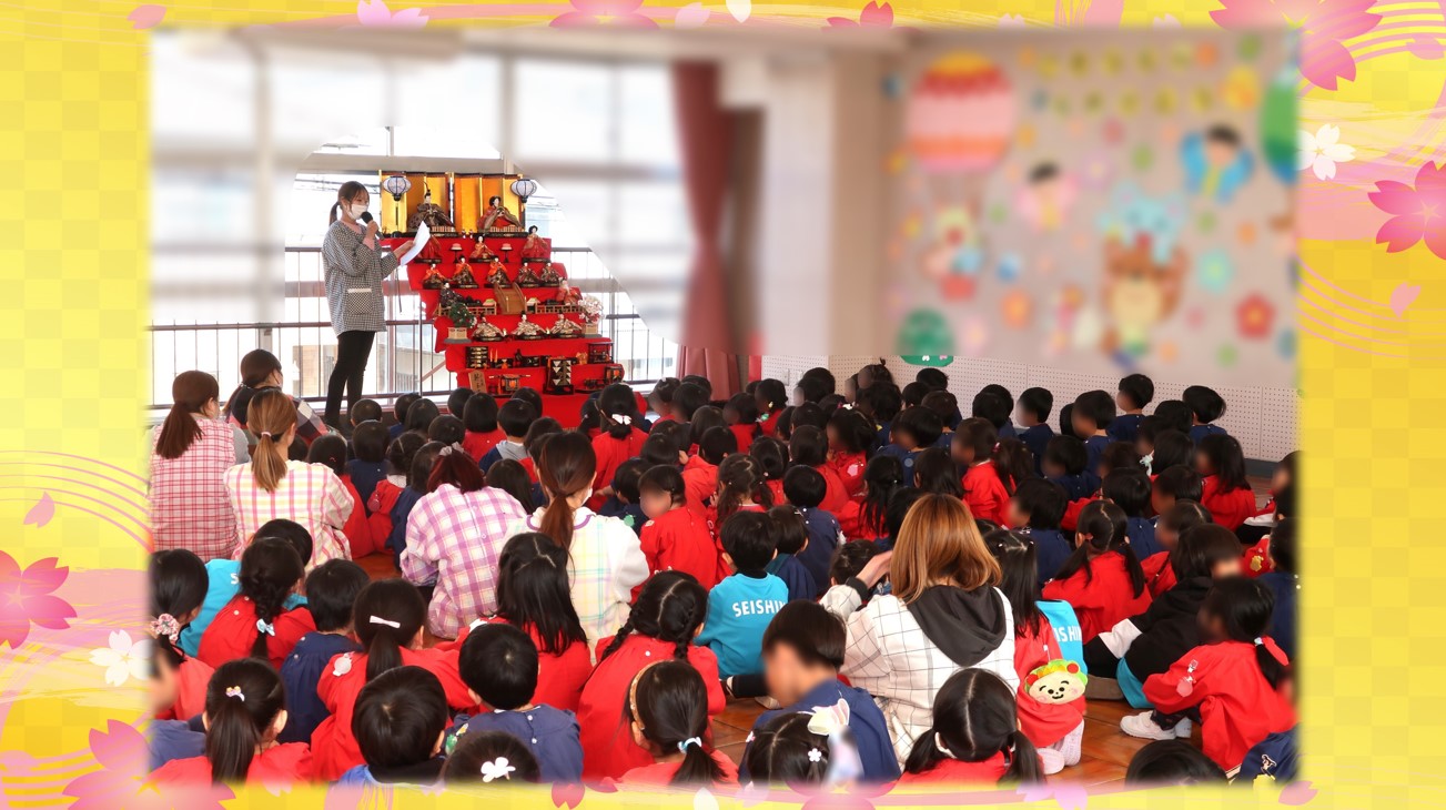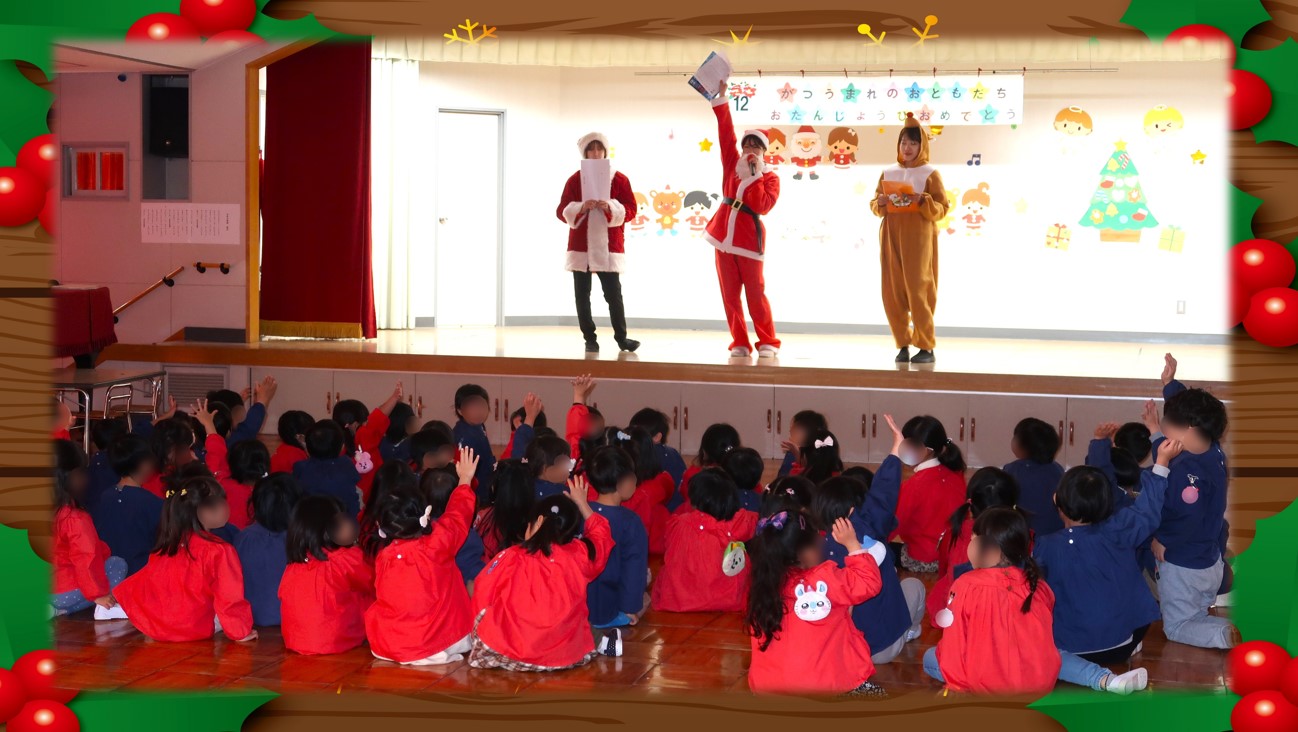 月 行事 4月 1学期始業式・入園式 5月 健康診断・歯科検診 6月 七夕遊戯会の練習 7月 七夕遊戯会 8月 年長組 お泊り保育 9月 2学期始業式 10月 運動会、秋の遠足(年中・年長組)、保育参観 11月 いもほり遠足、クリスマス遊戯会の練習 12月 クリスマス遊戯会、クリスマス会 1月 3学期始業式、新入園児面接 2月 作品展 3月 ひなまつり、卒園式・修了式